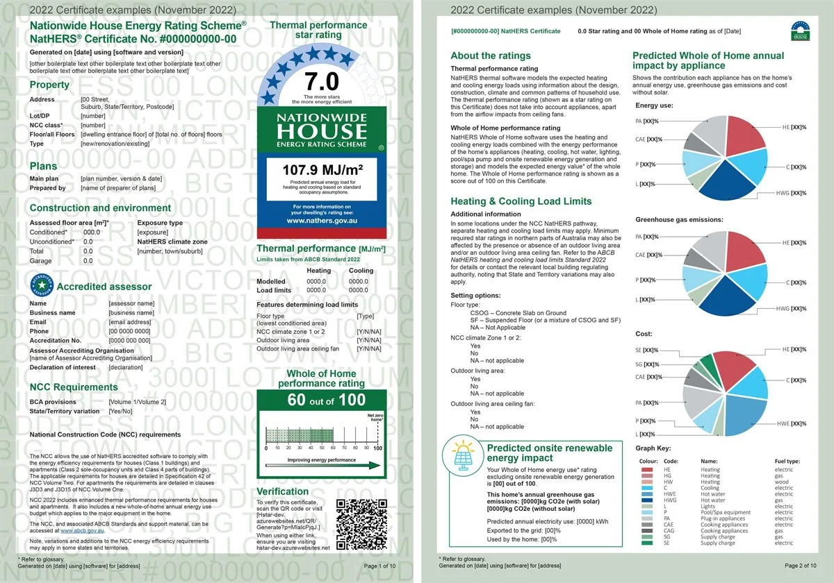 Image: Example NatHERS Certificate, showing a 7-star thermal performance rating and 60/100 Whole of Home score.